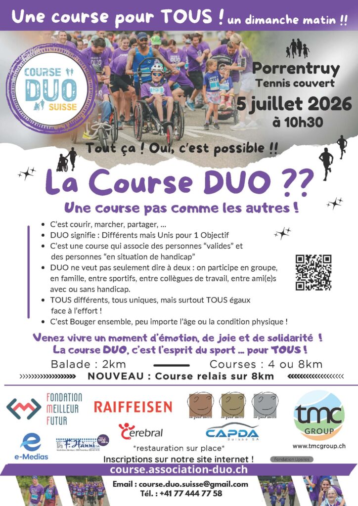 La Course D.U.O. revient le dimanche 5 juillet à Porrentruy pour une 8e édition ! Le départ et l’arrivée seront situés comme l’an passé au Tennis Couvert d’Ajoie, au Voyeboeuf.